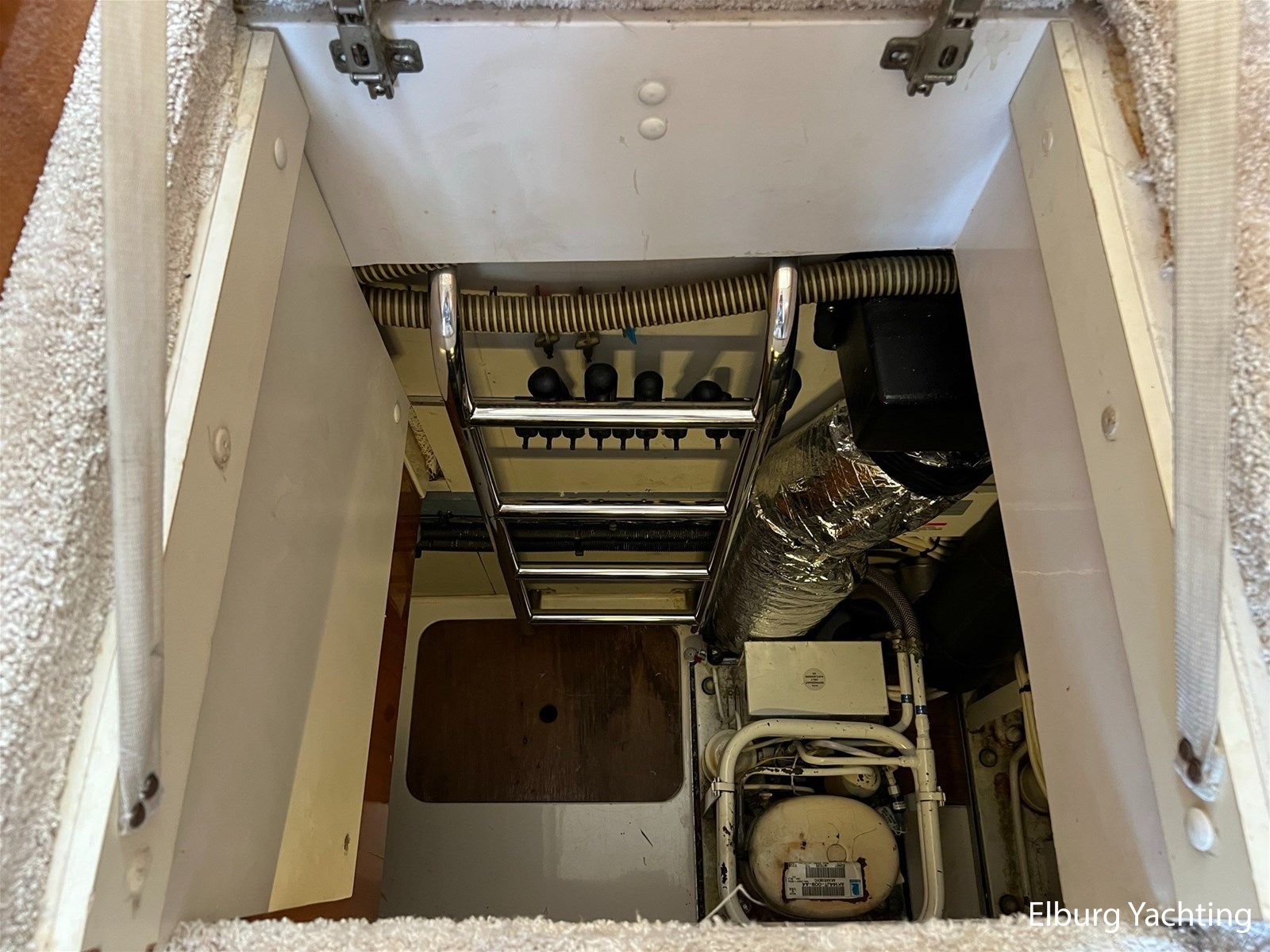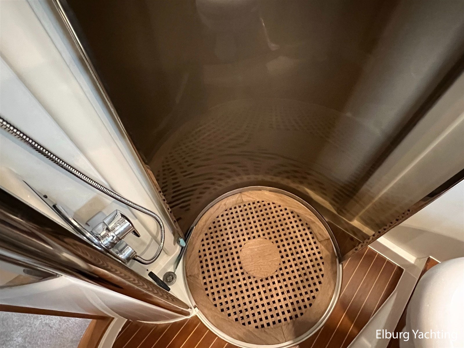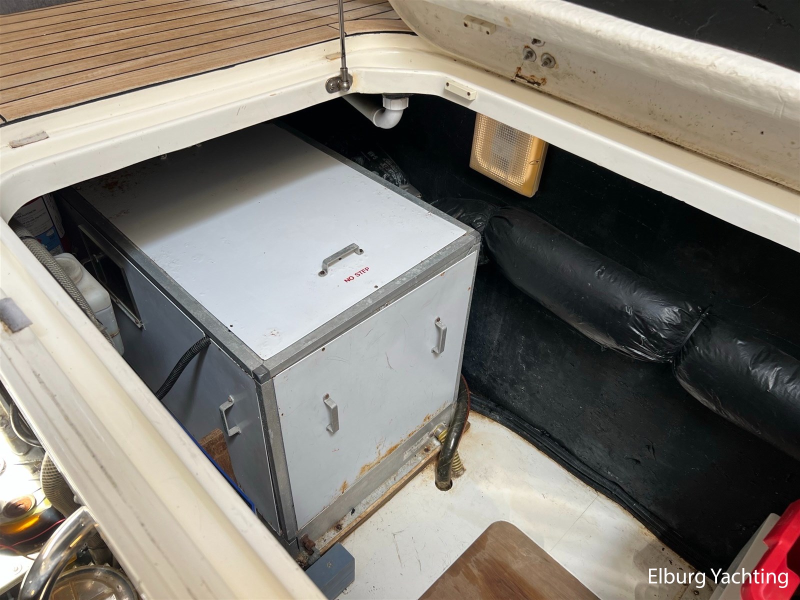 - Geïntegreerd met teak (dient vervangen te worden) + inklapbare r.v.s. zwemtrap